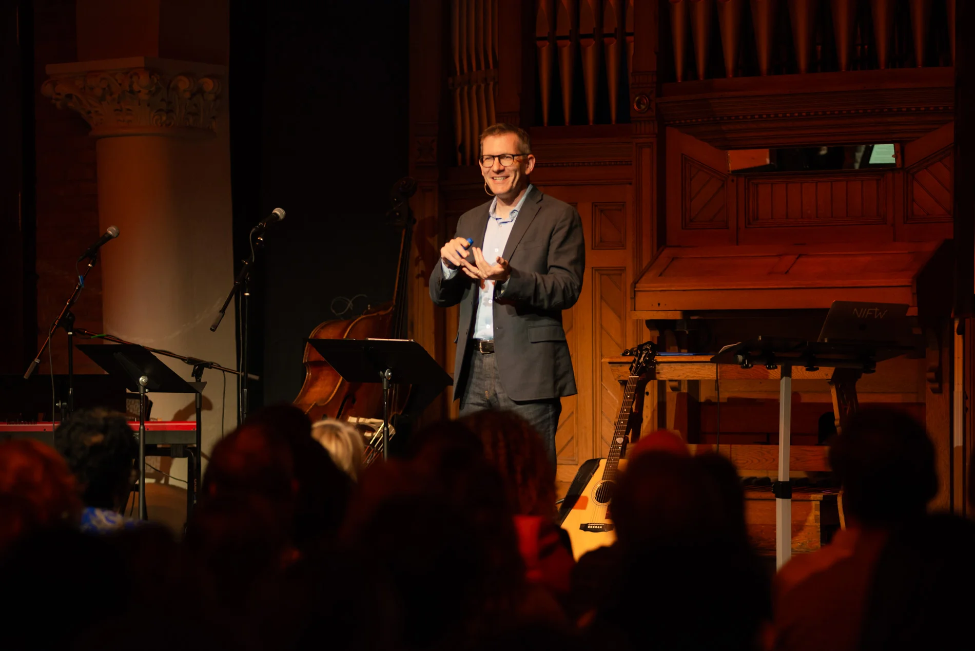 Andy Crouch stood in front of the beautiful antique organ and asked audience members to consider their own history. Had they grown up in a place of control, safety, suffering, or flourishing? Further, had they considered what it meant to move from whatever place they are in toward flourishing? A key, said Crouch, is how vulnerability and authority create opportunities for flourishing. Crouch then challenged the audience to examine their own influence and ask - right now, am I in a place of idolatry, withdrawal, suffering, or flourishing? Through live-texting the audience saw themselves as a part of a whole and then as a group learned the path to flourishing, which in the end involves great sacrifice.